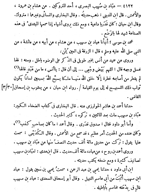 4122 - `Abbad Ibn S uhayb, uno de los abandonados. Narró, de Hisham Ibn `Urwah y al-Un mash`. Ibn al-Madini dijo: "Su h Adith se ha ido." Al-Bujari, al-Nasa'i y otros dijeron: "Abandonado". Ibn H ibban dijo: "Pertenecía a Qadariyyah y llamó a que en la parte superior de eso, él narró desautorizó narraciones de personajes famosos, tales narraciones, si oído por un principiante en este campo, que hubiera considerado que forjaron.".